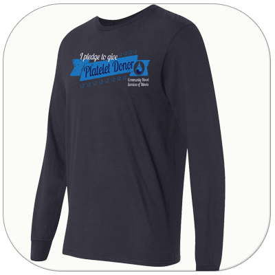 "I pledge to give" platelet donor navy t-shirt. Central Illinois Community Blood Center. Limited edition; will not reorder. Sizes may be limited.