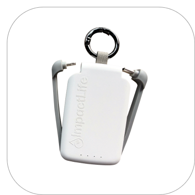 Compact and lightweight 2,000 mAh power bank with attached USB-C and Lightning charging cables. LED indicators lets show remaining battery life. Built-in LED light offers torch and SOS modes. Includes carabiner and USB charging cable. 1.75" X 2.75"